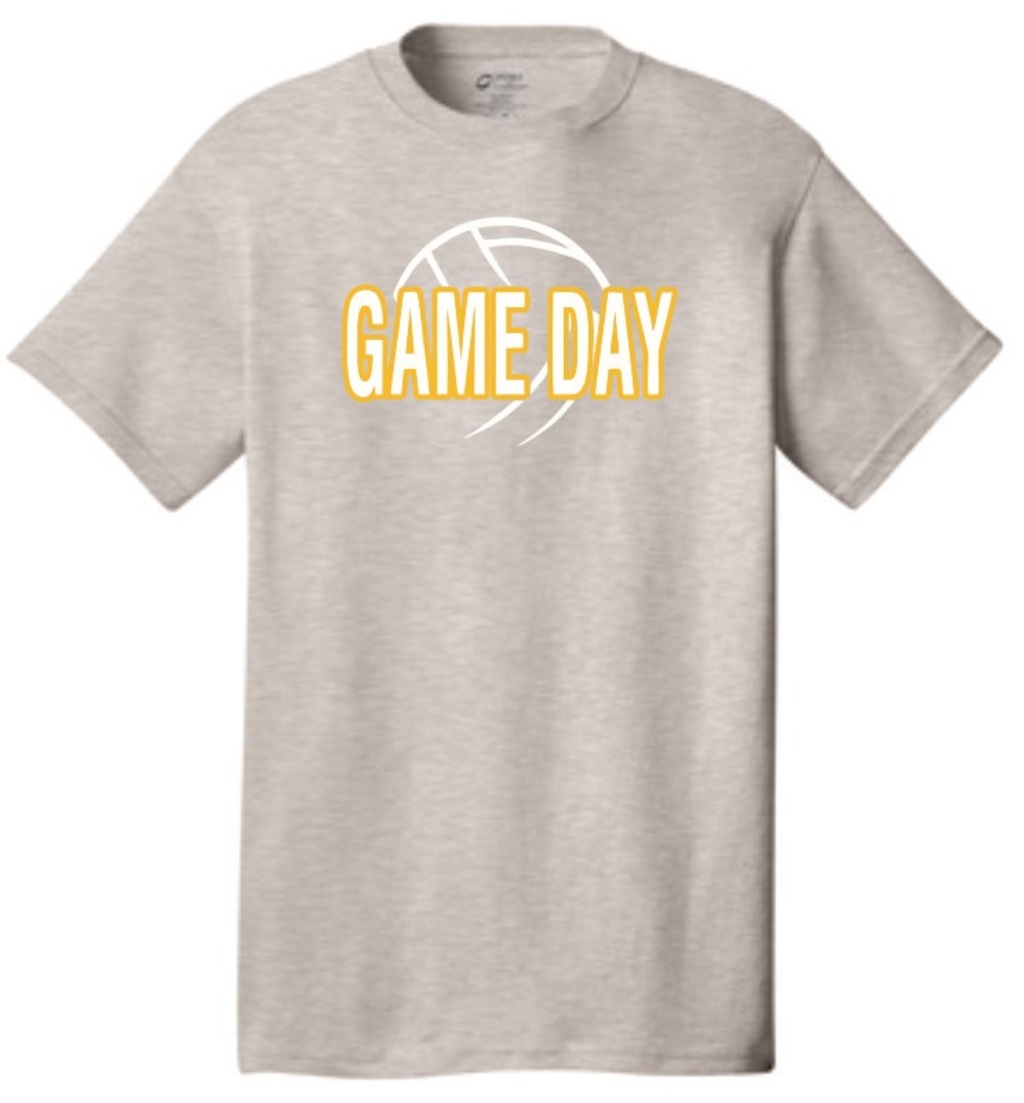 Port & Company ash gray 100% pre-shrunk cotton t-shirt with two color (gold and white) printed design on front.